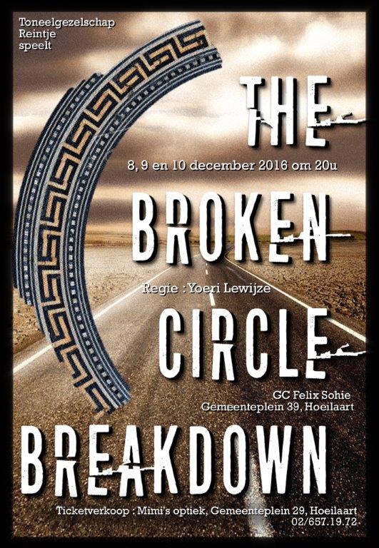 Op 8, 9 en 10 december 2016, telkens om 20 uur, presenteren wij jullie met veel trots: ‘The Broken Circle Breakdown’ van Johan Heldenbergh en Mieke Dobbels. Plaats van het gebeuren: het GC Felix Sohie in Hoeilaart.
