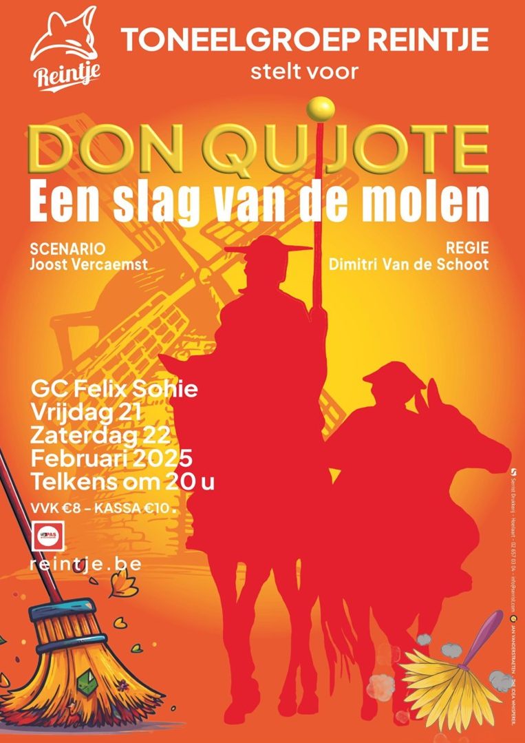In dit vrolijk stuk, gespeeld door een hele meute jong geweld, kom je ook te weten dat het Spaanse La Mancha een ridder rijker wordt. Tenminste, als Don Quijote iemand vindt die hem tot ridder wil slaan. Don Quijote verzamelt alles wat een ridder moet hebben: de bloedmooie jonkvrouw Dulcina van Toboso, een paard, een zwaard en een trouwe schildknaap. Hij trekt door Spanje om het onrecht te bestrijden. Verblind door de idealen van zijn helden moet hij het opnemen tegen monsters, reuzen, tovenaars en meer van dat fraais. Dat denkt hij toch…